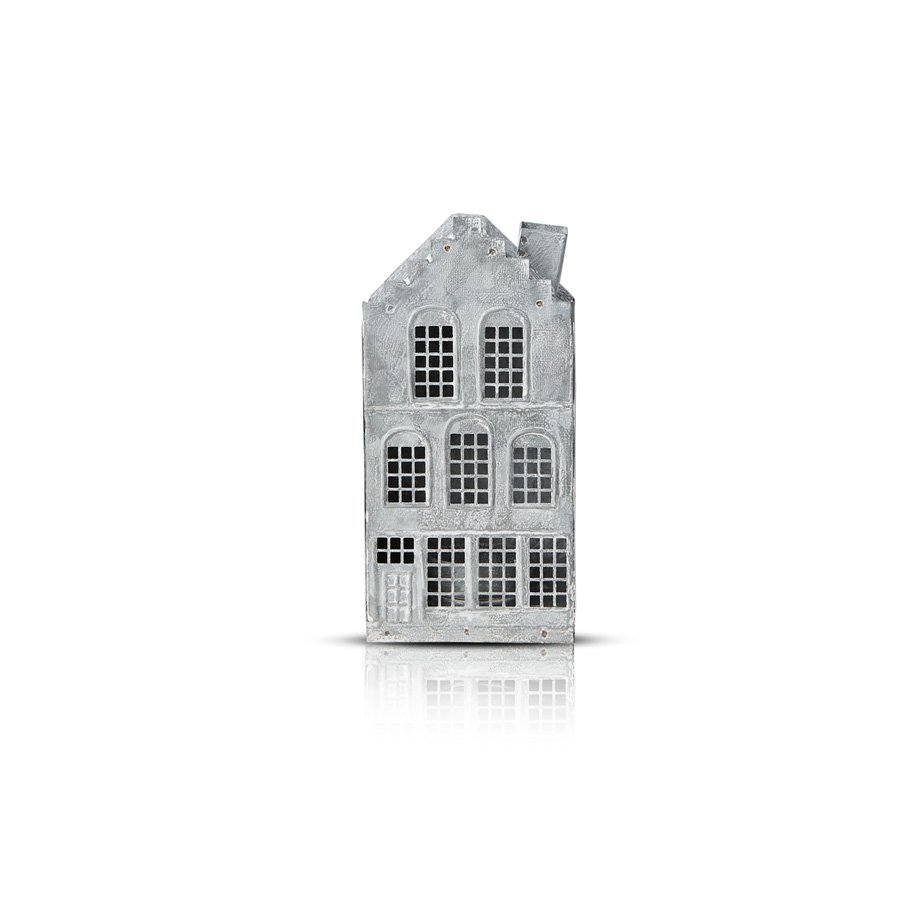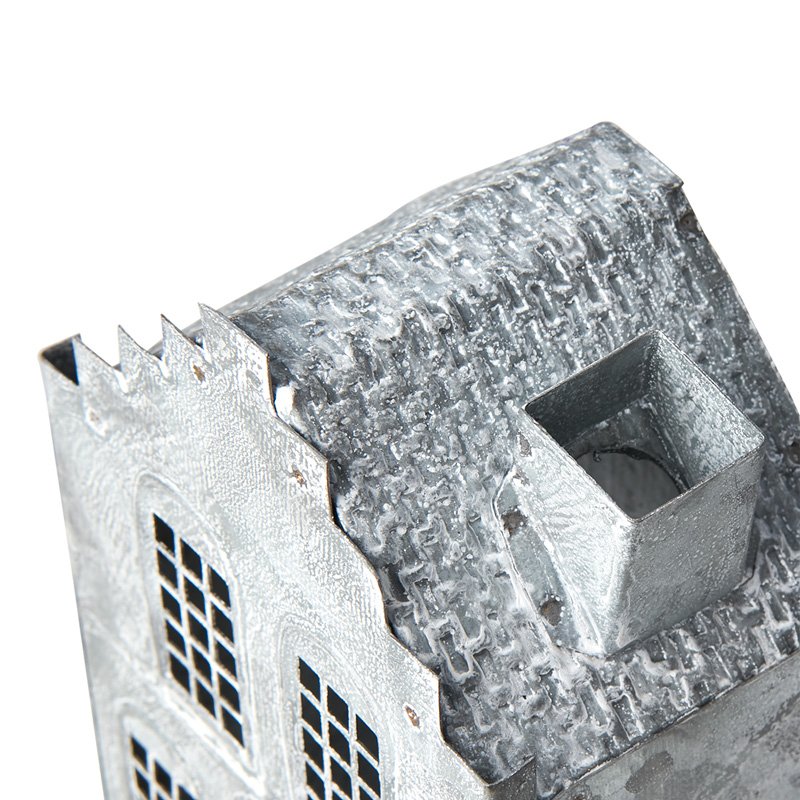 Ce [photophore] en métal gris blanc se distinguent par sa forme de maison pleine de charme/ Conçu pour accueillir des bougies chauffe-plat, il laisse passer une lumière tamisée à travers ses fenêtres créant une atmosphère chaleureuse/