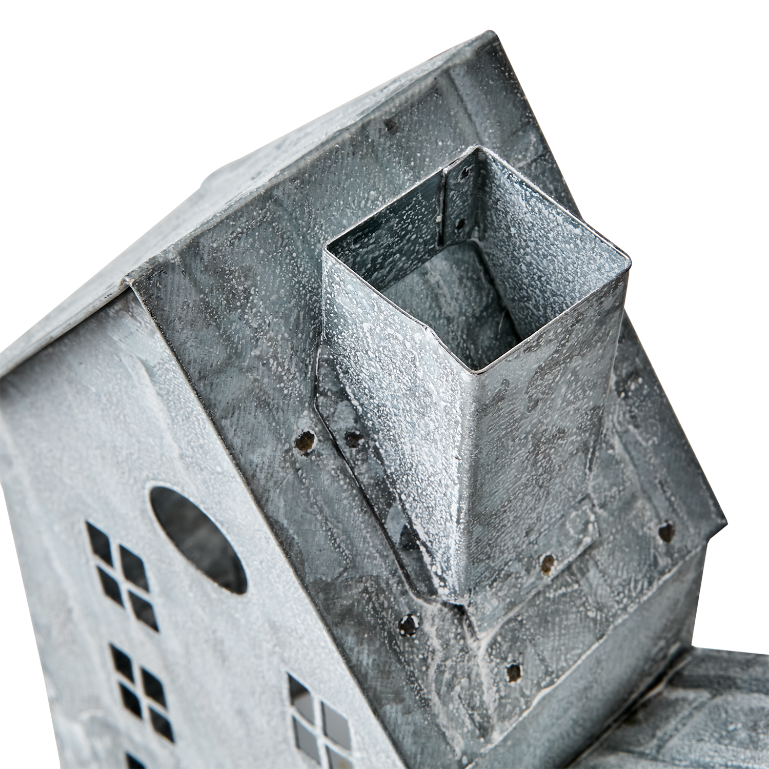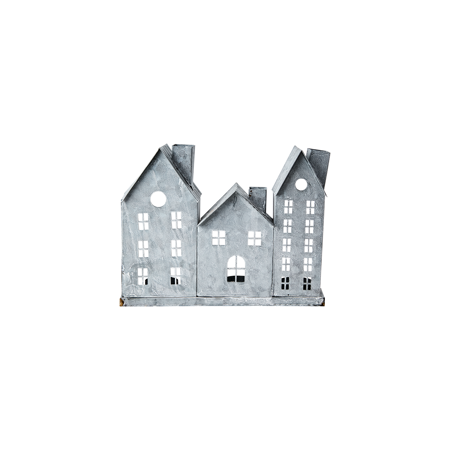Ce [photophore] en métal gris/blanc se distinguent par sa forme de petit village plein de charme/ Conçu pour acceuillir des bougies chauffe-plat, il laisse passer une lumière tamisée à travers ses fenêtres créant une atmosphère chaleureuse/