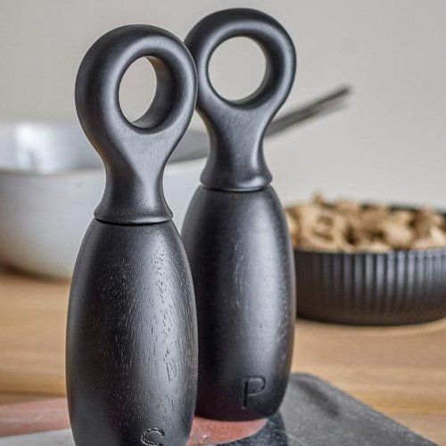 Moulins [ Sel & Poivre ] noir / Des modèles travaillés en bois d’hévéa noir avec une grande poignée pour une meilleure prise en main / Lorsqu’ils ne sont pas utilisés, ils peuvent être exposés comme déco dans la cuisine ou sur la table 😉