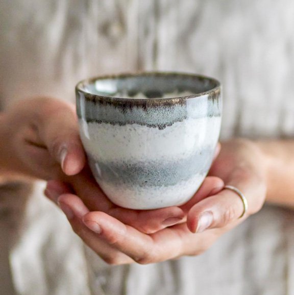 Ce mug est réalisé en grès, avec un émail réactif et une finition peinte à la main / Le motif associe des blocs verts à de doux tons beige et rose dans un dessin géométrique / De légères variations de motif et d’intensité des couleurs peuvent apparaître, rendant chaque pièce unique /