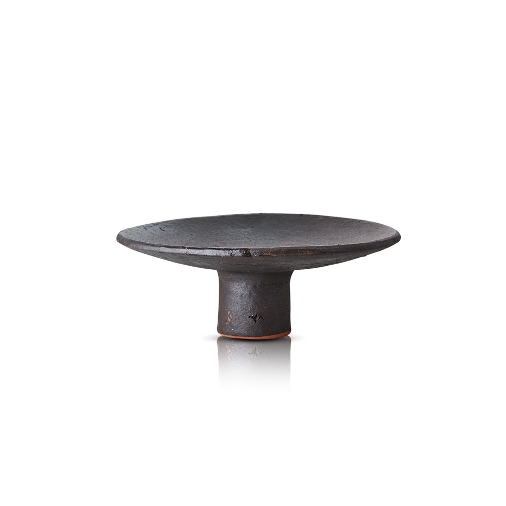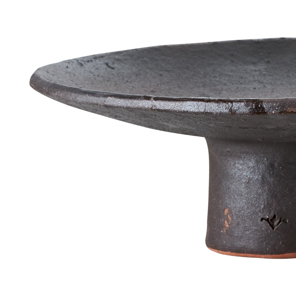 Un plat sur pied en grès noir au design artisanal et raffiné/ Son noir profond apporte une touche d’élégance et de caractère à votre intérieur/