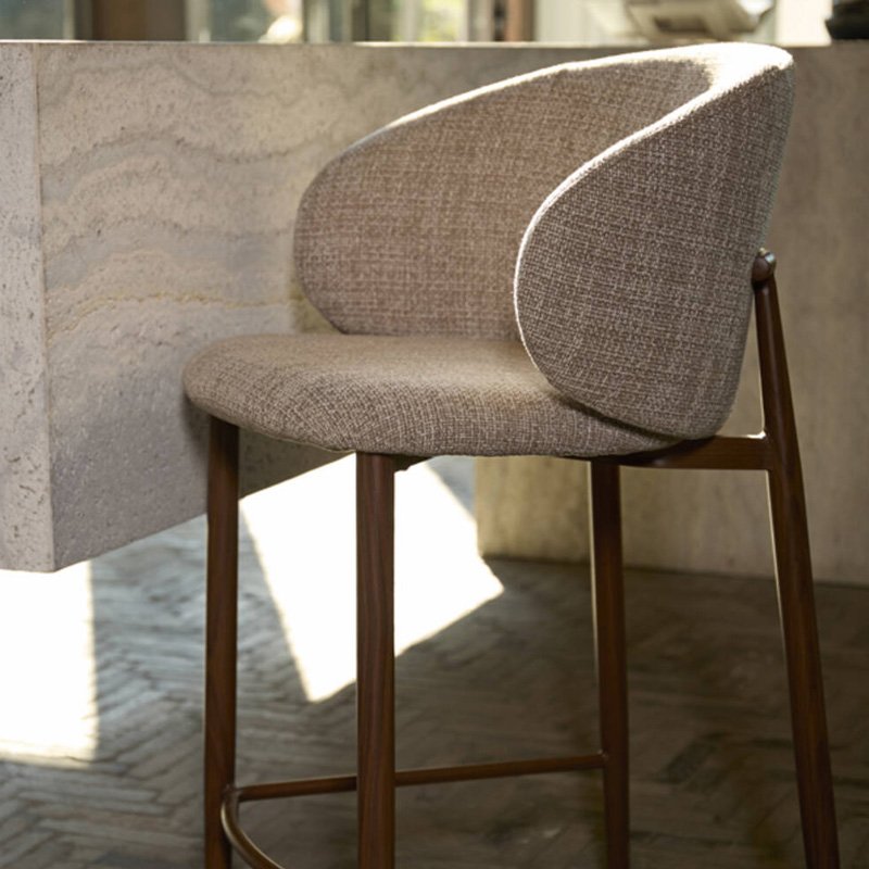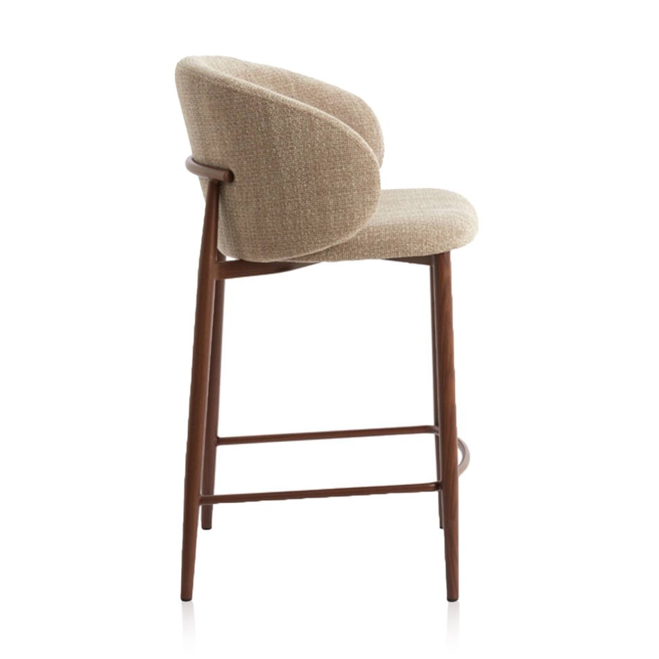 Un tabouret cosy & confortable pour ce modèle [Aloko] ici en coloris beige : / Une structure en métal à la finition bois foncé type noyer associée à un coussin rembourré pour le dossier et l’assise /