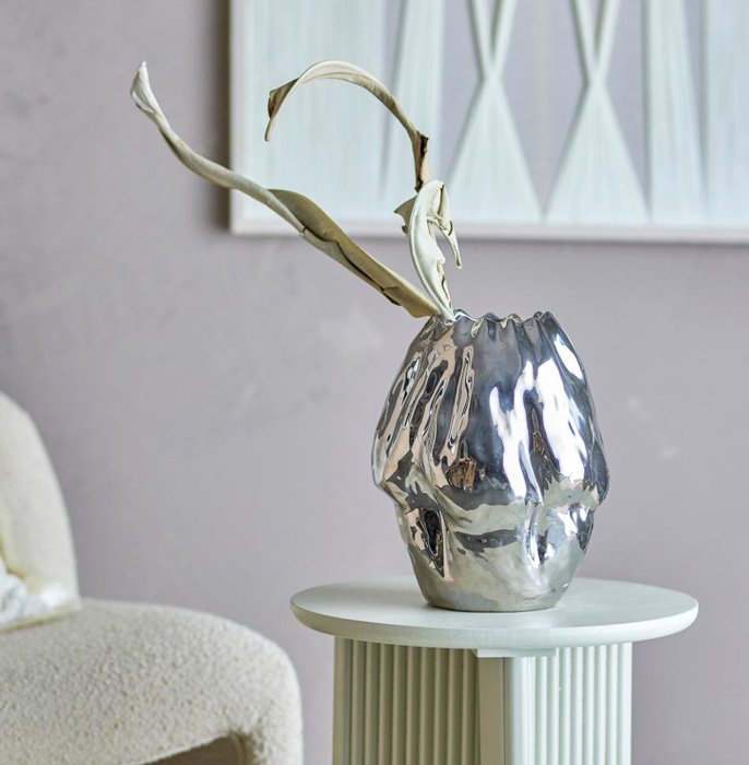 Réalisé en grès, ce magnifique vase [Chrome] présente une surface brillante de couleur argentée qui capte magnifiquement la lumière / La forme organique & l’aspect élégant font de ce vase un très bel élément décoratif dans la maison /